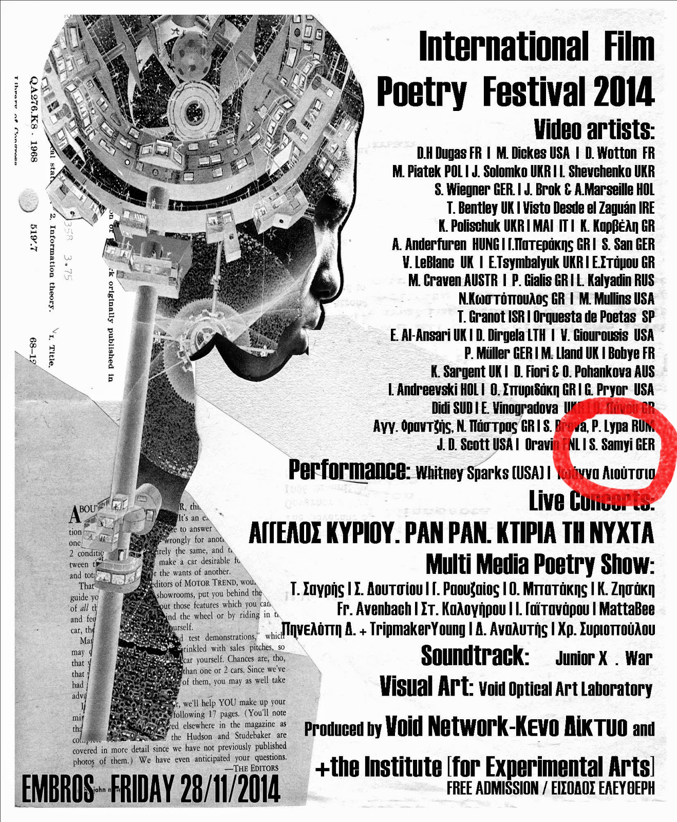 art, textart and poetry, video International Film Poetry Festival, Athens 28.11.2014 Verfasst von Sheida Samyi am November 25, 2014April 6, 2015 I am happy to be part of it! my poetry film debut: gleich/ even https://vimeo.com/92260820 Gefällt mir Wird geladen …