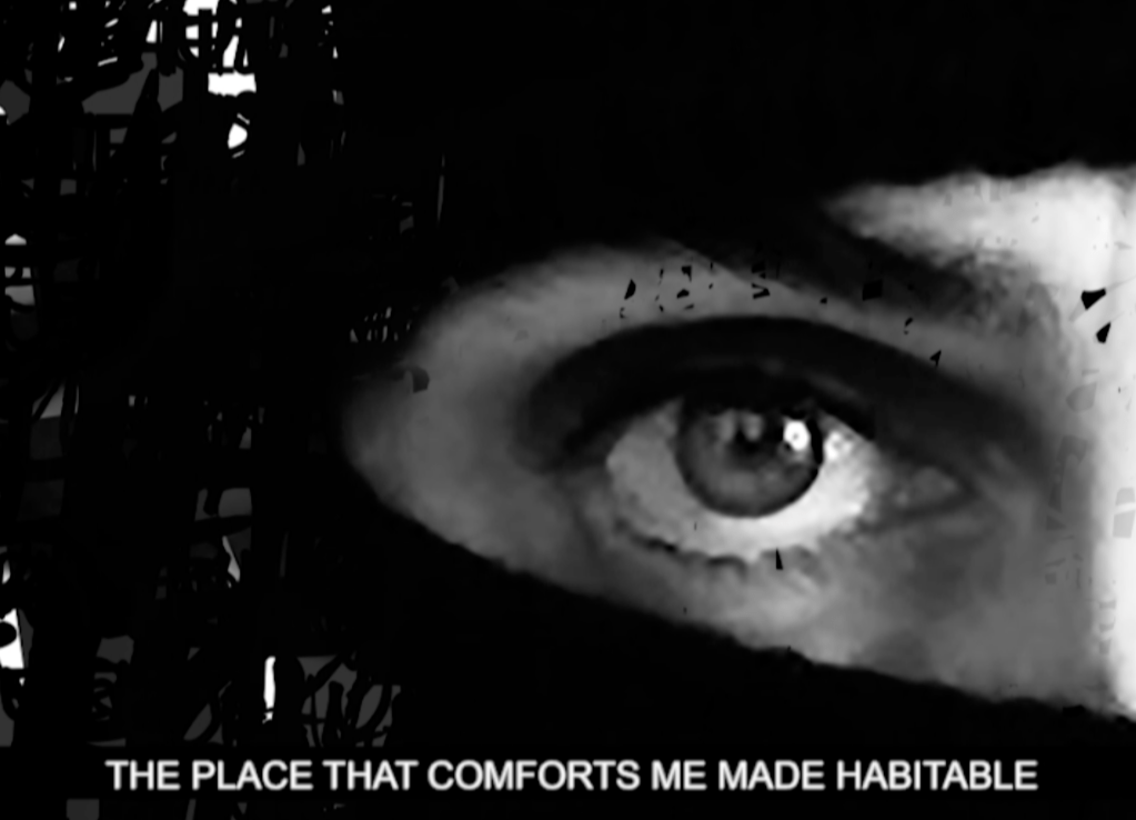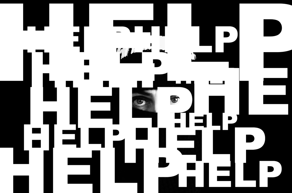 Das Bild zeigt mich, als eine vermummte Frau, deren Gesicht weitgehend durch eine schwarze Mütze und ein schwarzes Gesichtstuch verdeckt ist. Nur meine Augen sind klar zu erkennen und starren eindringlich in die Kamera. Auf der Mütze ist das Wort „HELP“ (Hilfe) in großen, weißen Buchstaben geschrieben. Meine Augen sind klar und ausdrucksstark, während der Rest des Gesichts bedeckt ist und ich eins mit dem Hintergrund bin, dort wo ich mich am sichersten fühle. Ein Einblick in den Ort, an dem ich mich versteckt halte.