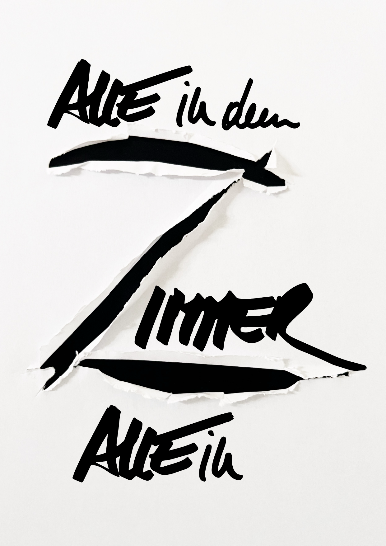 Das „Z“ habe ich mit dem Stanleymesser, leider nicht wie Zorro mit dem Degen, aus einem Blatt Papier geschnitten. Die dadurch entstandene räumliche Tiefe erzeugt den Eindruck, dass das Wort „Zimmer“ sich in den Betrachterraum erstreckt. Es vermittelt das Gefühl eines Raumes, der gleichzeitig offen und geschlossen ist – ein metaphorischer Verweis auf „A room of one´s own“ von Virginia Woolfs. Das Zorro-Symbol steht hier für Autonomie und das Recht auf eigene Räume. (Zorro hilft hispanischen Siedlern und indigenen Völkern, die von den Herrschern unterdrückt werden.)