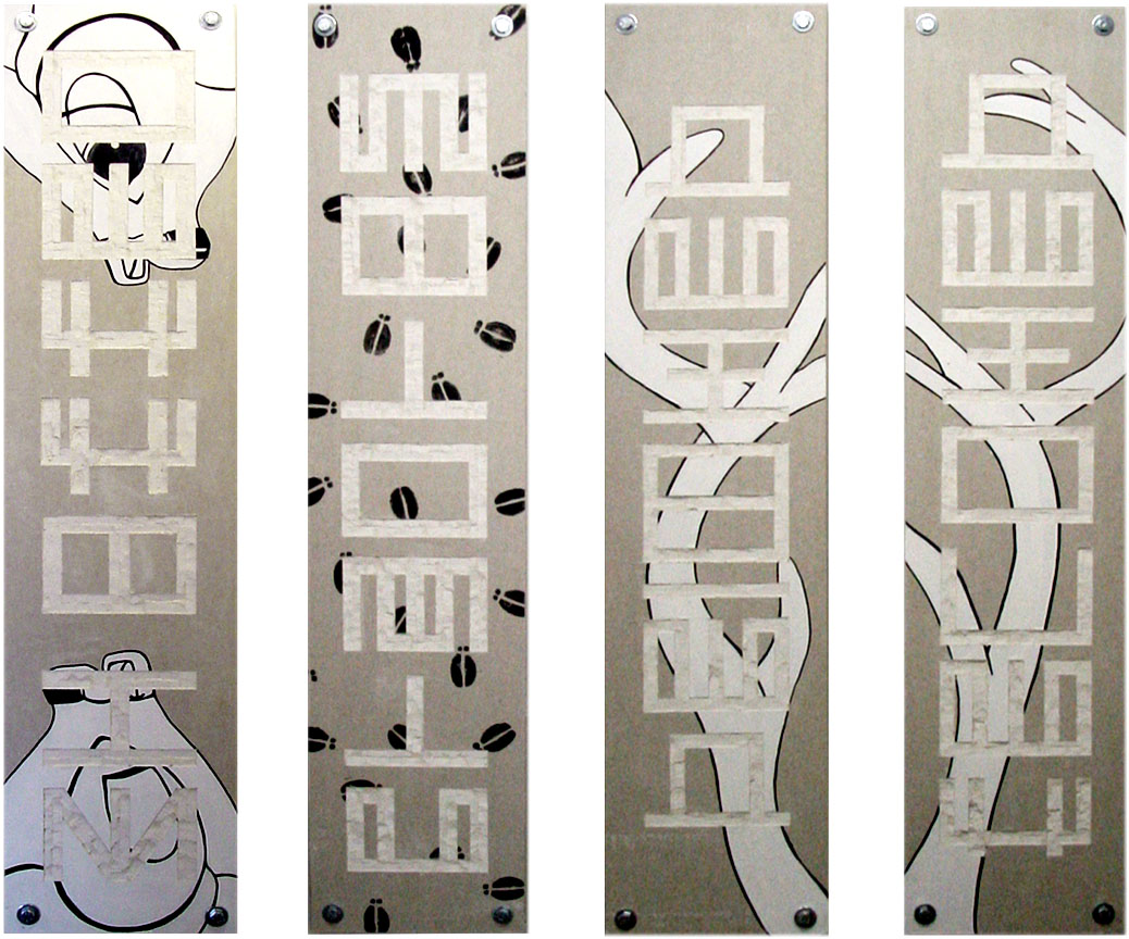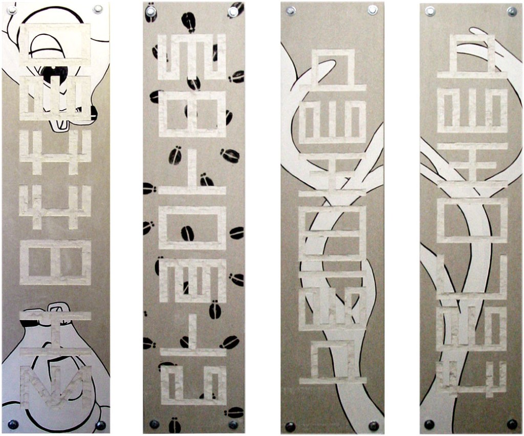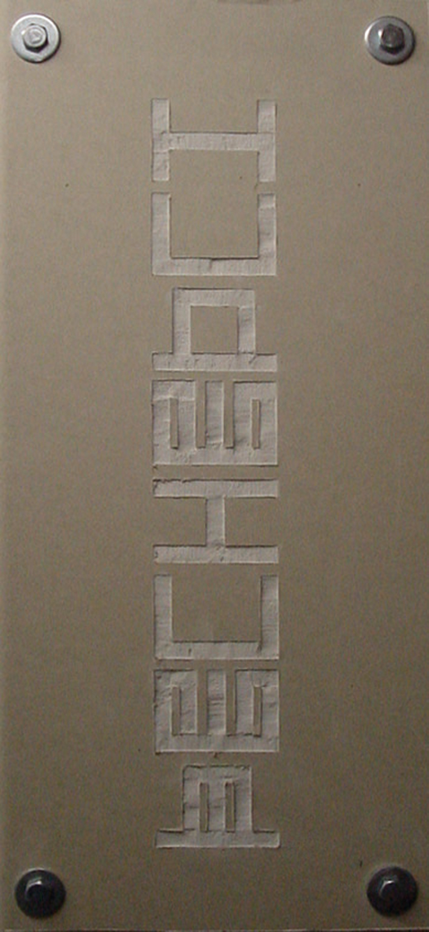 Nach den Duplikatenzen entwarf ich das Schriftbild BLICKLINKS, die Komposition eines Wortes und dessen Reflexion. Um es entziffern zu können, muss man den Kopf nach links neigen und von unten nach oben lesen, während man die rechte Hälfte des Schriftzuges in Gedanken abdeckt.