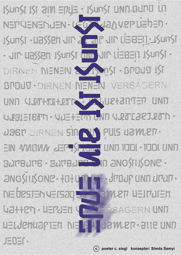 Das textbasierte Kunstduo poeter c. Siegl und Sheida Samyi haben eine weltweit neue Form des Kunsttextes namens Duplikatenzen erfunden, die Sie von zwei Seiten lesen können. Die Darstellungsweise basiert hauptsächlich auf dem Konzept, den Text aus der Wand zu stemmen und Glaswürfel mit dem entstehenden Schutthaufen aufzufüllen, wodurch dieser unlesbare Text im Gegensatz zu den Duplikatenzen steht. Ausstellungen im In- und Ausland von 1996-01.